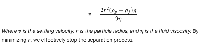 To prevent this and enhance stability, we use weighting agents like SAIB (Sucrose Acetate Isobutyrate) or Ester Gum to increase the oil’s density until it matches the water phase (1.00 g/cm3. Furthermore, reducing droplet size to the “nano” scale (100–200 nm) via high-pressure homogenization ensures the emulsion remains stable according to Stokes’ Law: